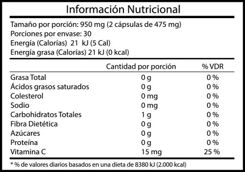 - No Contiene: azúcar, lactosa, gluten, almidón, sal, levaduras, saborizantes, colorantes artificiales, conservantes ni edulcorantes, No Genéticamente Modificado.